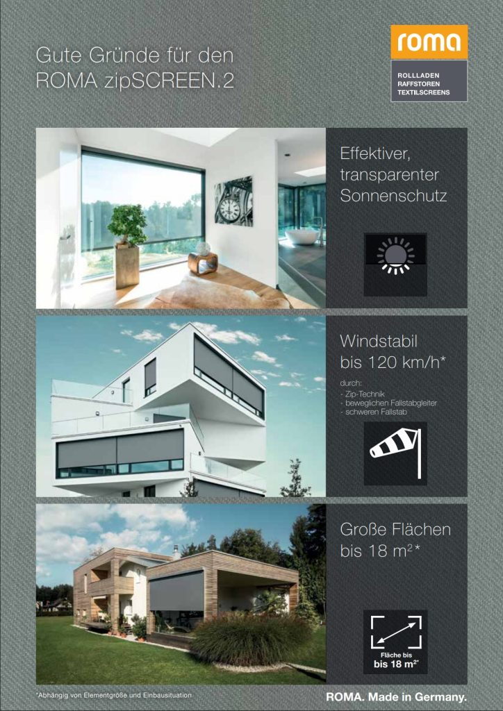 ZIP-Screens eignen sich besonders für große Fensterflächen und moderne Architektur. Sie bieten effektiven Sonnenschutz bei gleichzeitig guter Durchsicht nach außen.